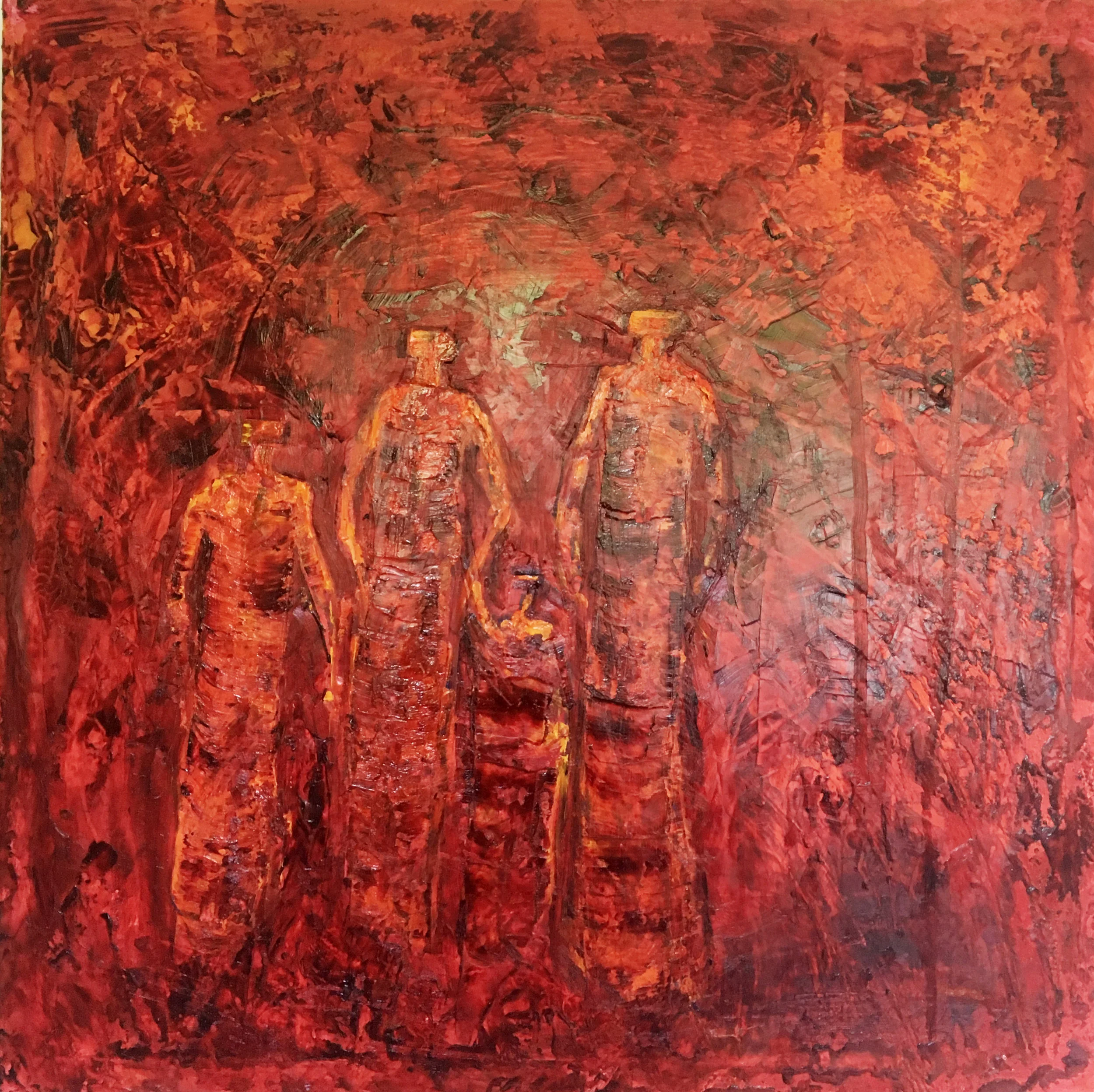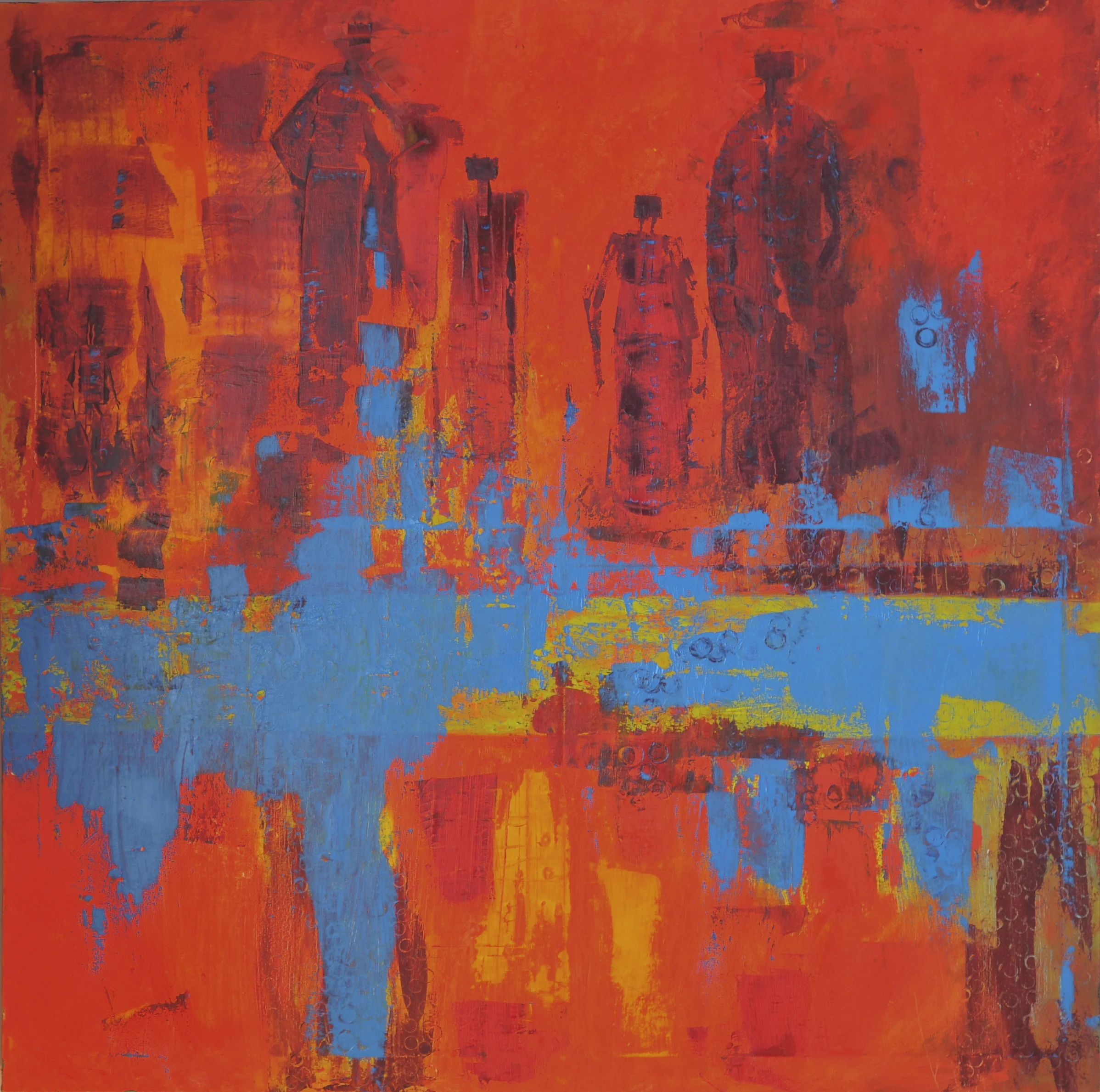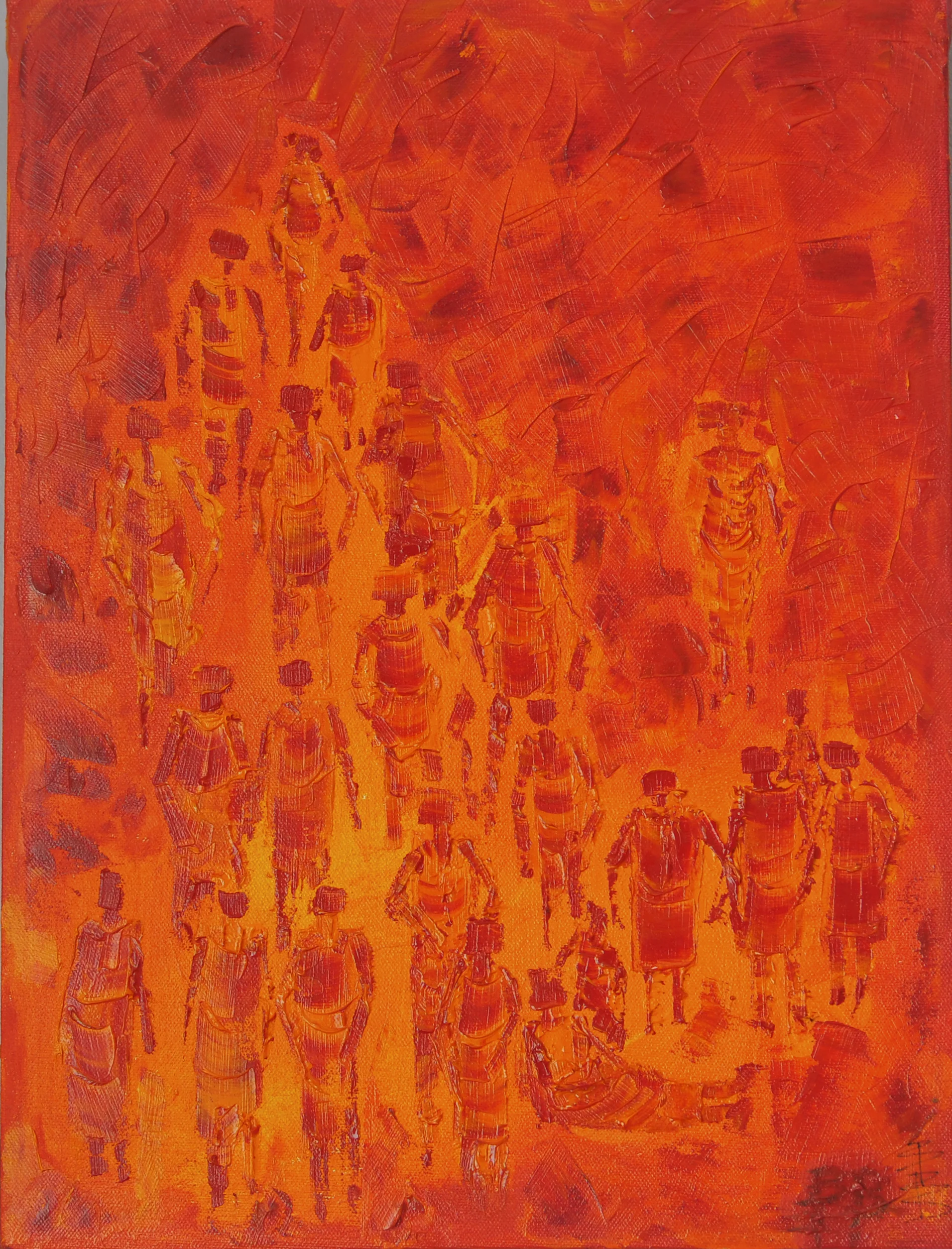 Exodus explores the notion of identity in migration, how individuals lose their sense of being and cultural belonging, when forced to move because of displacement, war or the search for a better life. The series of paintings and sculptures begin with canvases of faceless, human icons. This is to represent the current portrayal of migrant populations. They are dehumanised into a single entity, as crowds, without a voice. With such portrayals, we as the viewers are often unable to establish direct empathy, as there are no individuals to relate with, and sometimes the human element is obscured below the surface.